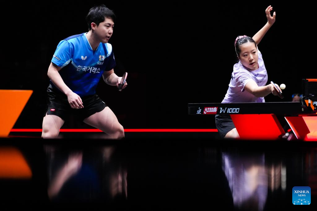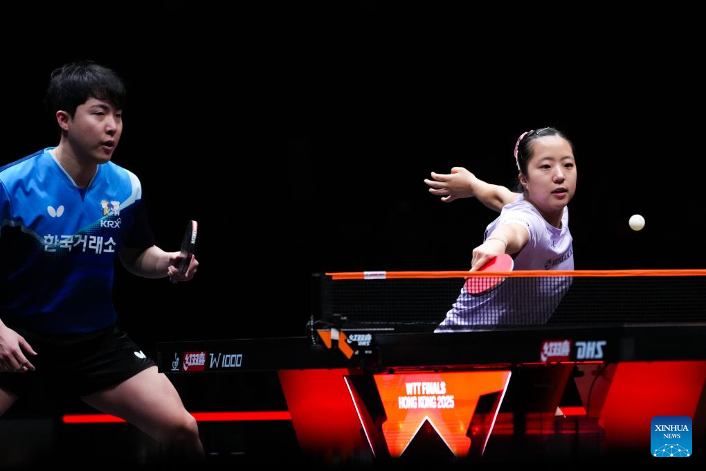 Lim Jonghoon (L)/Shin Yubin of South Korea compete during the mixed doubles group 2 match between Lim Jonghoon/Shin Yubin of South Korea and Hugo Calderano/Bruna Takahashi of Brazil of the WTT Finals Hong Kong 2025 in Hong Kong, south China, Dec. 10, 2025. (Xinhua/Zhu Wei)