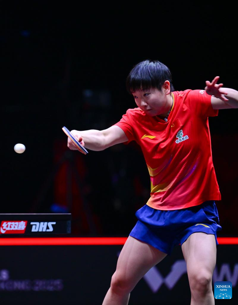 Wang Yidi competes during the women's singles round of 16 match between Sun Yingsha of China and Wang Yidi of China at the WTT Finals Hong Kong 2025 in Hong Kong, south China, Dec. 11, 2025. (Xinhua/Zhu Wei)