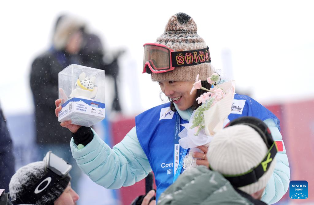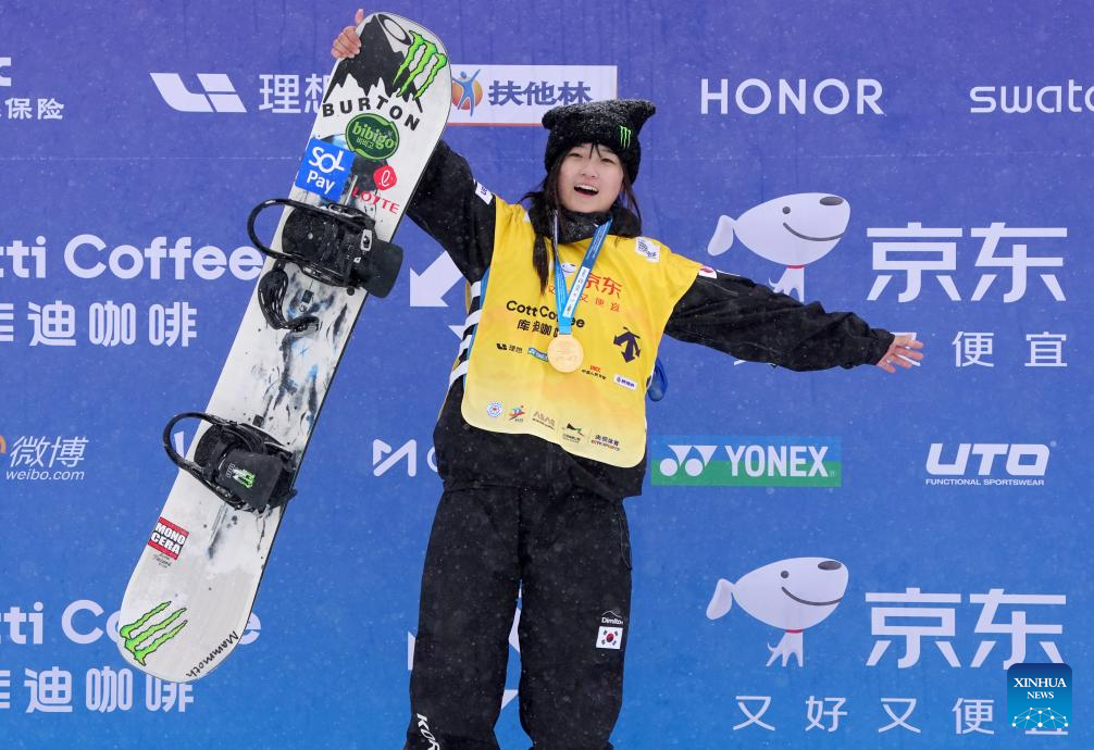 Gold medalist Choi Gaon of South Korea reacts during the awarding ceremony for the women's snowboard halfpipe final of FIS Snowboard World Cup 2025 in Zhangjiakou, north China's Hebei Province, Dec. 12, 2025. (Xinhua/Wang Peng)