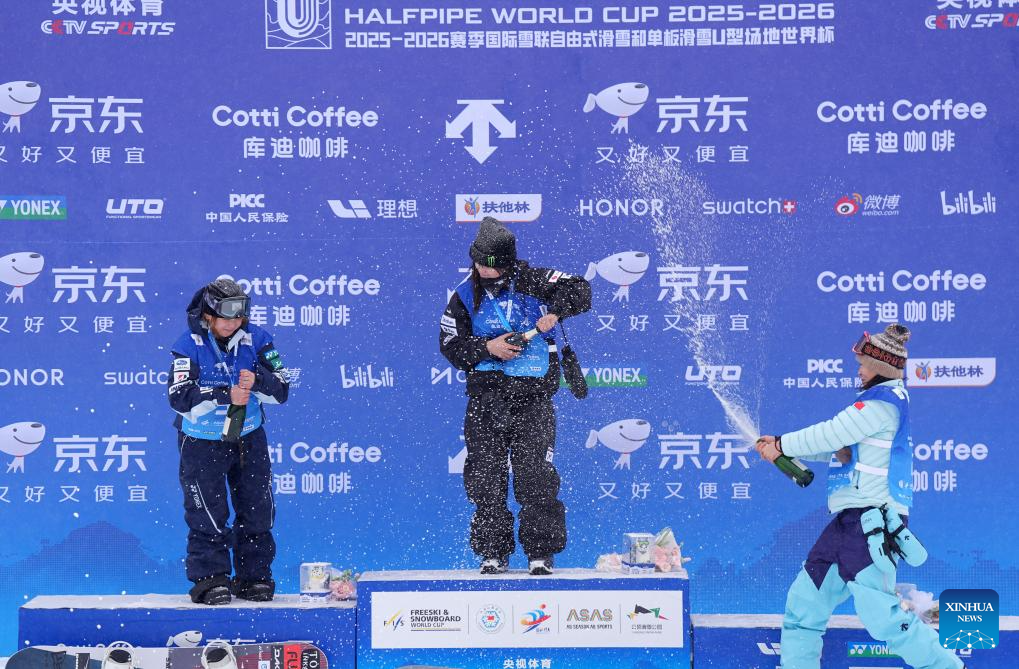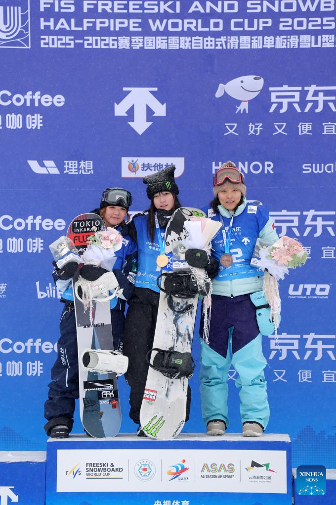Gold medalist Choi Gaon (C) of South Korea, silver medalist Kudo Rise (L) of Japan and bronze medalist Cai Xuetong of China celebrate during the awarding ceremony for the women's snowboard halfpipe final of FIS Snowboard World Cup 2025 in Zhangjiakou, north China's Hebei Province, Dec. 12, 2025. (Xinhua/Wang Peng)
