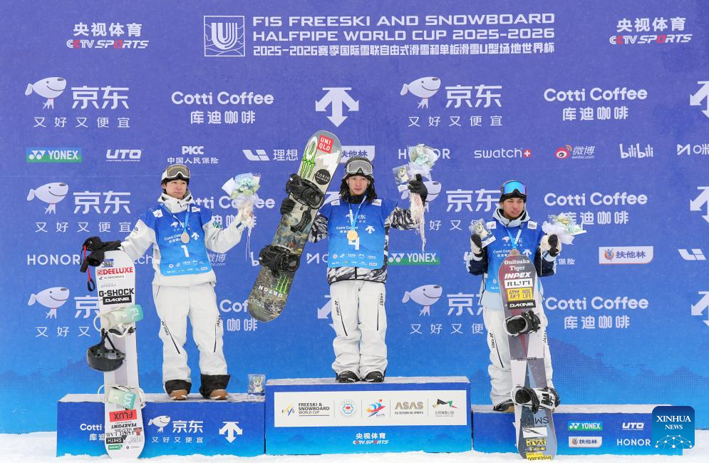Gold medalist Japan's Hirano Ayumu (C), silver medalist Japan's Totsuka Yuto (L) and bronze medalist Japan's Hirano Ruka pose during the awarding ceremony after the men's snowboard halfpipe final of FIS Snowboard World Cup 2025 in Zhangjiakou, north China's Hebei Province, Dec. 12, 2025. (Xinhua/Wang Peng)