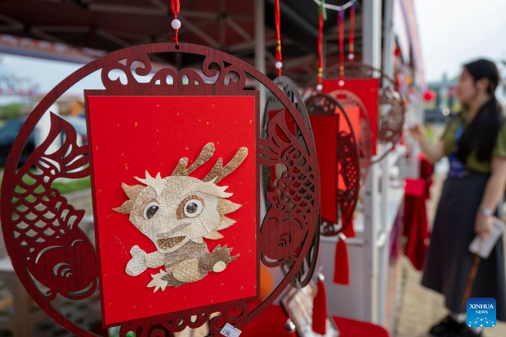 Visitors look at fish skin handicrafts of the Hezhe ethnic group in Fuyuan, northeast China's Heilongjiang Province, July 1, 2025. (Xinhua/Zhang Tao)