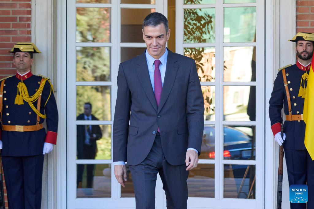 This file photo taken on Nov. 27, 2025 shows Spanish Prime Minister Pedro Sanchez walking out of La Moncloa Palace in Madrid, Spain. U.S. operations in international waters targeting alleged drug-trafficking activities pose a challenge to international law and raise questions about the West's consistency in applying its principles, Sanchez has said.(Xinhua/Meng Dingbo)