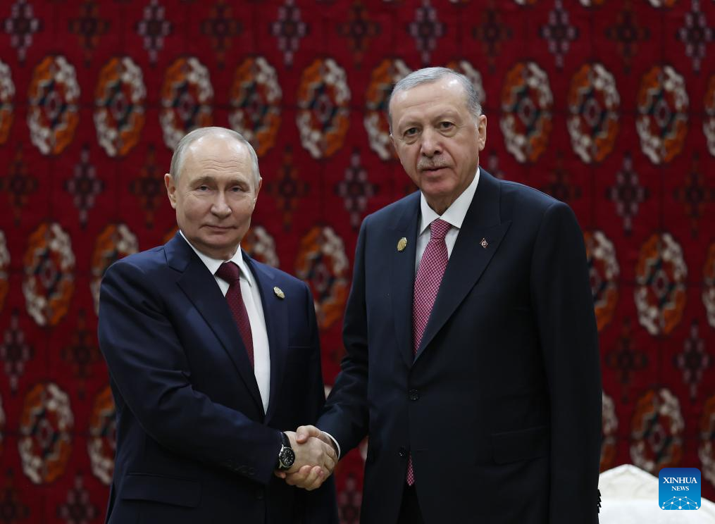 Turkish President Recep Tayyip Erdogan (R) meets with his Russian counterpart Vladimir Putin on the sidelines of an international peace forum in Ashgabat, Turkmenistan, on Dec. 12, 2025. (Presidency of the Republic of Türkiye/Handout via Xinhua)