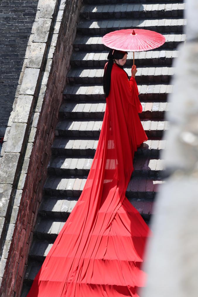 A tourist poses for photos on the Xi'an City Wall in Xi'an, northwest China's Shaanxi Province, Sept. 12, 2025. (Xinhua/Zhu Weixi)