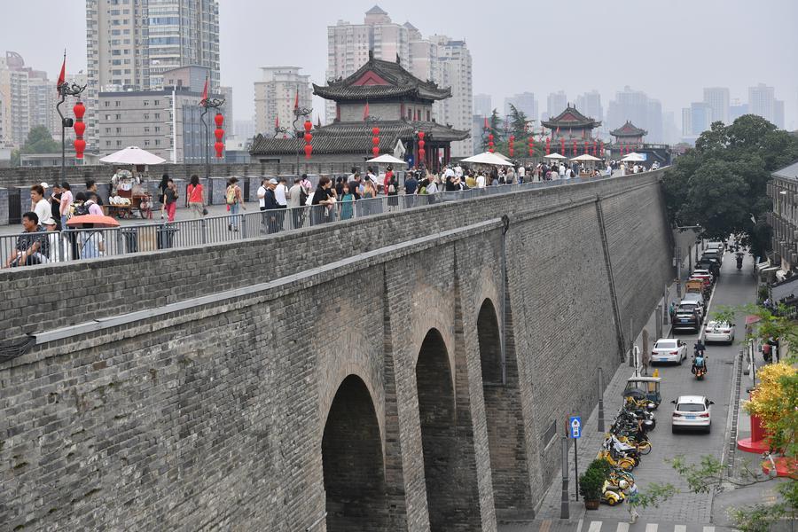 Tourists visit the Xi'an City Wall in Xi'an, northwest China's Shaanxi Province, Sept. 10, 2025. (Xinhua/Shao Rui)