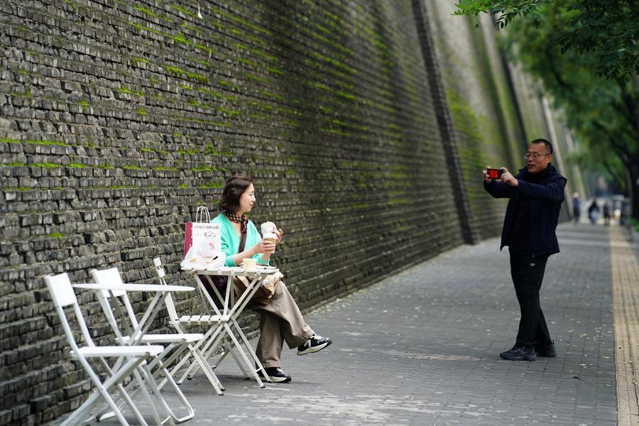 A tourist poses for photos beside the Xi'an City Wall in Xi'an, northwest China's Shaanxi Province, Oct. 13, 2025. (Xinhua/Shao Rui)