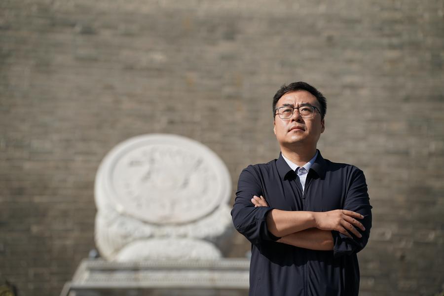 Zhao Bin is pictured on the Yongning Gate of the Xi'an City Wall in Xi'an, northwest China's Shaanxi Province, Sept. 12, 2025. (Xinhua/Shao Rui)