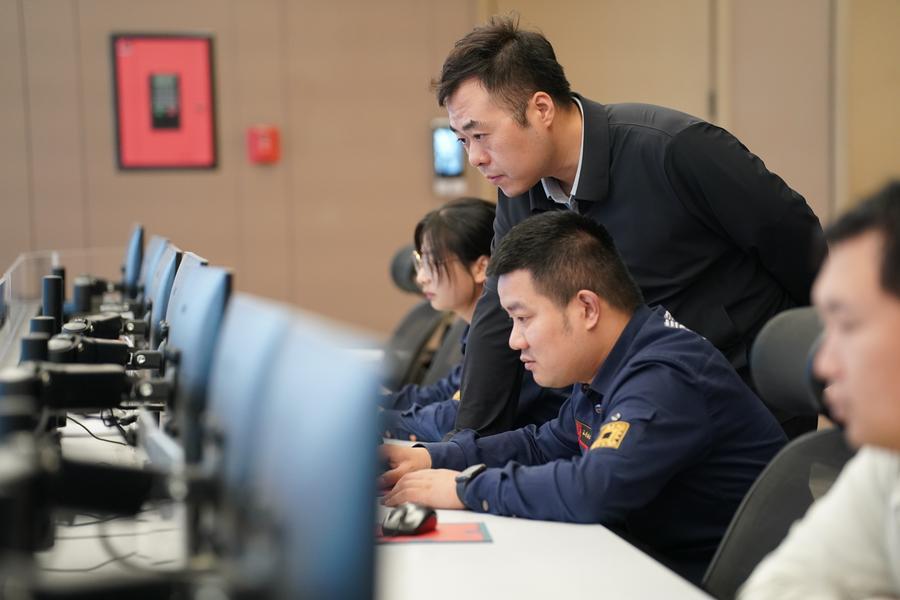 Staff members monitor via a digitalized management platform for the Xi'an City Wall in Xi'an, northwest China's Shaanxi Province, Sept. 10, 2025. (Xinhua/Shao Rui)