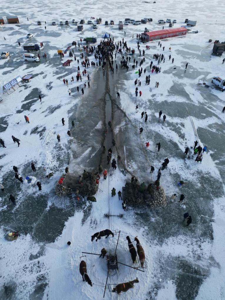 To thunderous drumbeats, horses pulled winches at the icy expanse of Chagan Lake, hauling up a kilometer-long net from beneath the frozen surface.