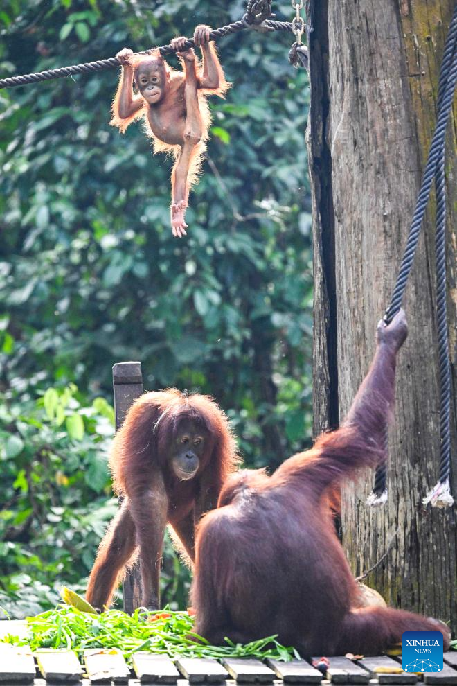 This photo taken on Jan. 21, 2026 shows bornean orangutans (Pongo pygmaeus) in Sandakan, Malaysia. (Xinhua/Cheng Yiheng)