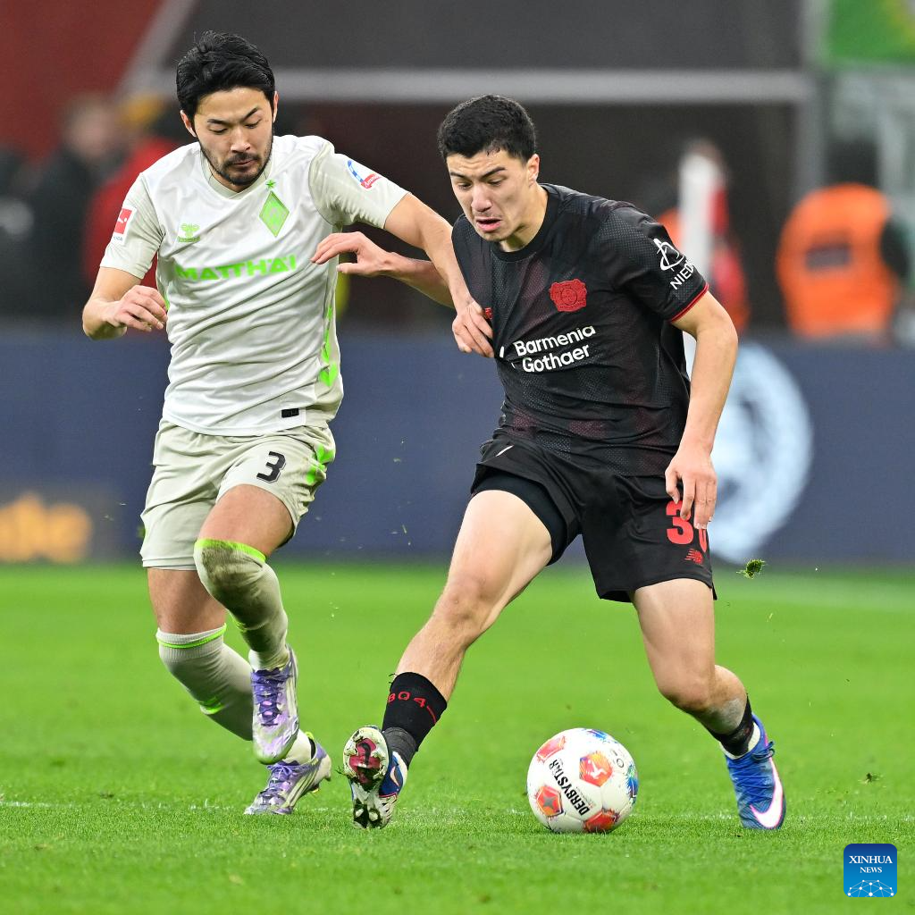 Ibrahim Maza (R) of Bayer 04 Leverkusen vies with Sugawara Yukinari of SV Werder Bremen during the German first division Bundesliga football match between Bayer 04 Leverkusen and SV Werder Bremen in Leverkusen, Germany, Jan. 24, 2026. (Photo by Ulrich Hufnagel/Xinhua)