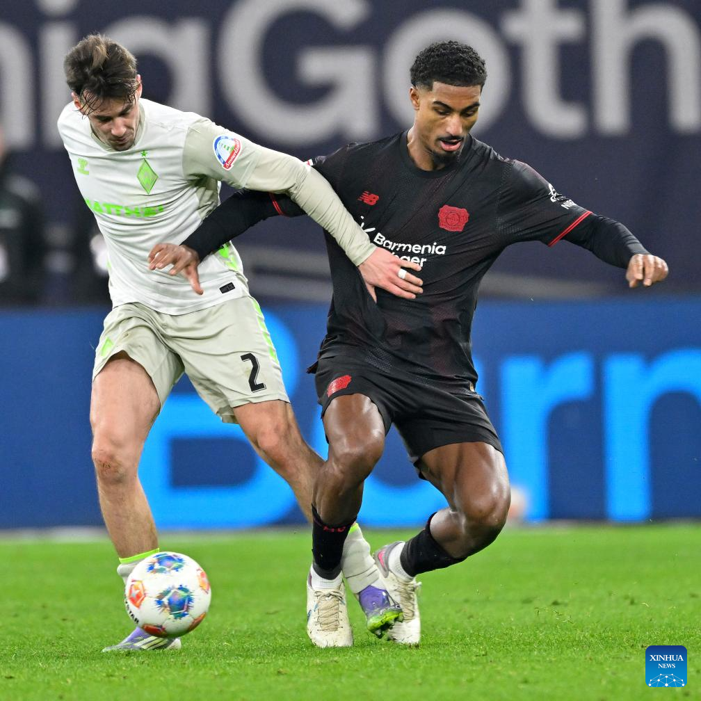 Loic Bade (R) of Bayer 04 Leverkusen vies with Olivier Deman of SV Werder Bremen during the German first division Bundesliga football match between Bayer 04 Leverkusen and SV Werder Bremen in Leverkusen, Germany, Jan. 24, 2026. (Photo by Ulrich Hufnagel/Xinhua)