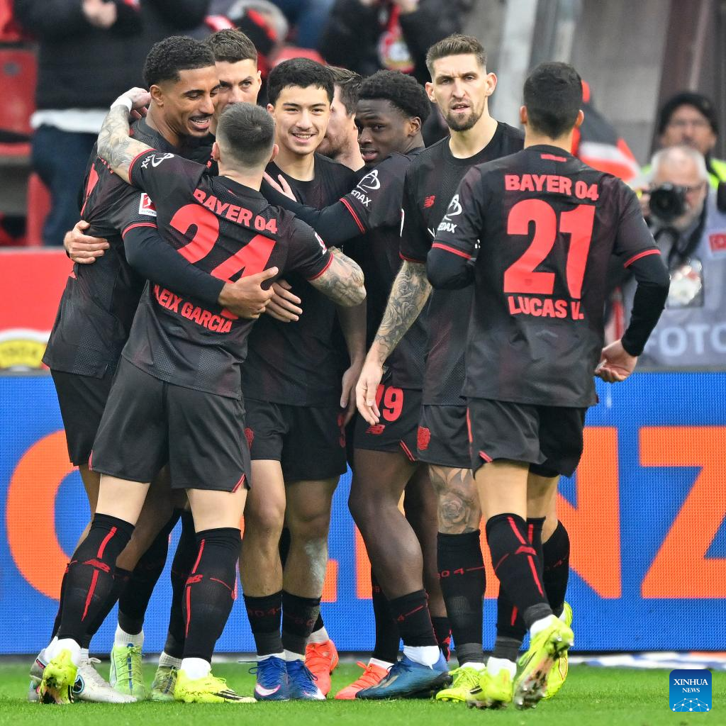 Players of Bayer 04 Leverkusen celebrate scoring during the German first division Bundesliga football match between Bayer 04 Leverkusen and SV Werder Bremen in Leverkusen, Germany, Jan. 24, 2026. (Photo by Ulrich Hufnagel/Xinhua)