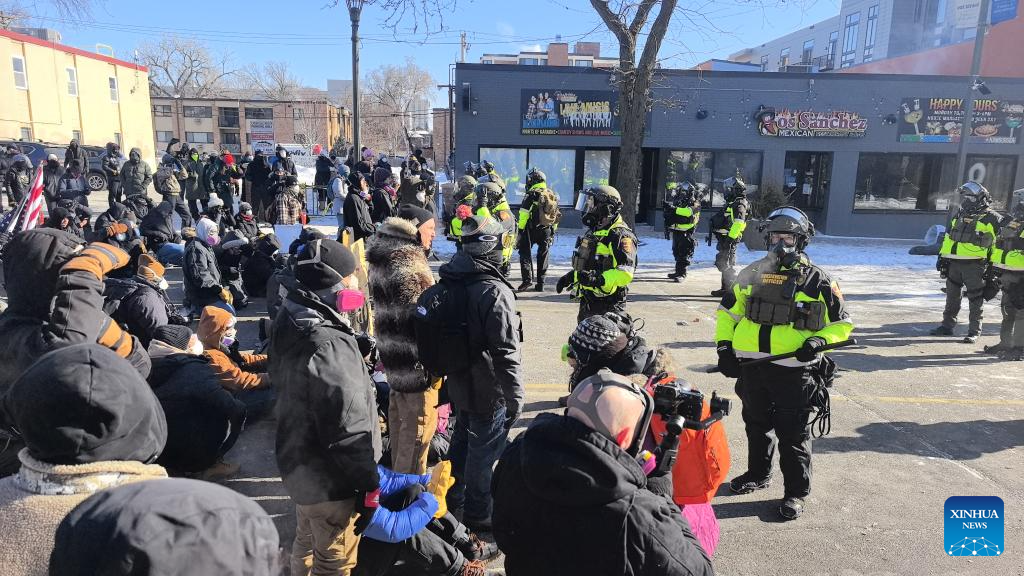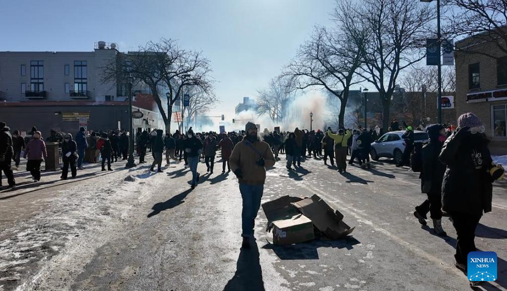 This photo taken with a mobile phone shows people attending a protest in Minneapolis, Minnesota, the United States, on Jan. 24, 2026. A man was shot and killed by federal agents in Minneapolis, the largest city in the U.S. state of Minnesota, on Saturday morning, authorities said. This incident marks the third shooting involving federal law enforcement officers in the city this month. (Xinhua)