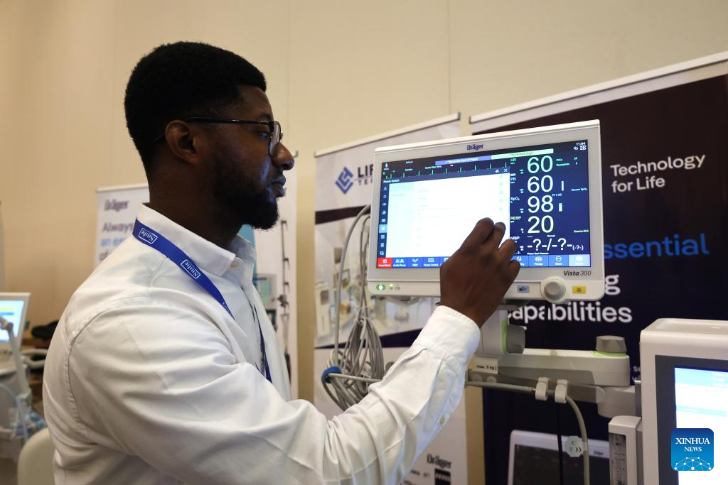 An exhibitor checks a patient monitoring machine at the World Health Expo Leaders Africa Summit in Accra, Ghana, on Dec. 9, 2025. TO GO WITH "Ghanaian president urges private sector to co-invest in Africa's health industrialization" (Photo by Seth/Xinhua)