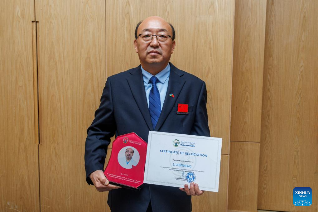 Li Junsheng, a member of the 25th Chinese medical team in Rwanda, receives a special award from Rwanda's Ministry of Health during a ceremony marking the arrival of the 26th Chinese medical team in Rwanda and the departure of the 25th team in Kigali, Rwanda, Jan. 22, 2026. The ceremony was held in the capital of Rwanda on Thursday night, highlighting sustained cooperation between Rwanda and China in the health sector. (Photo by Cyril Ndegeya/Xinhua)
