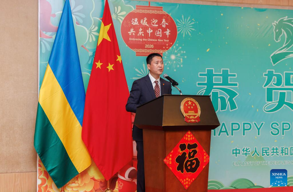Chinese Ambassador to Rwanda Gao Wenqi speaks during a ceremony marking the arrival of the 26th Chinese medical team in Rwanda and the departure of the 25th team in Kigali, Rwanda, Jan. 22, 2026. The ceremony was held in the capital of Rwanda on Thursday night, highlighting sustained cooperation between Rwanda and China in the health sector. (Photo by Cyril Ndegeya/Xinhua)