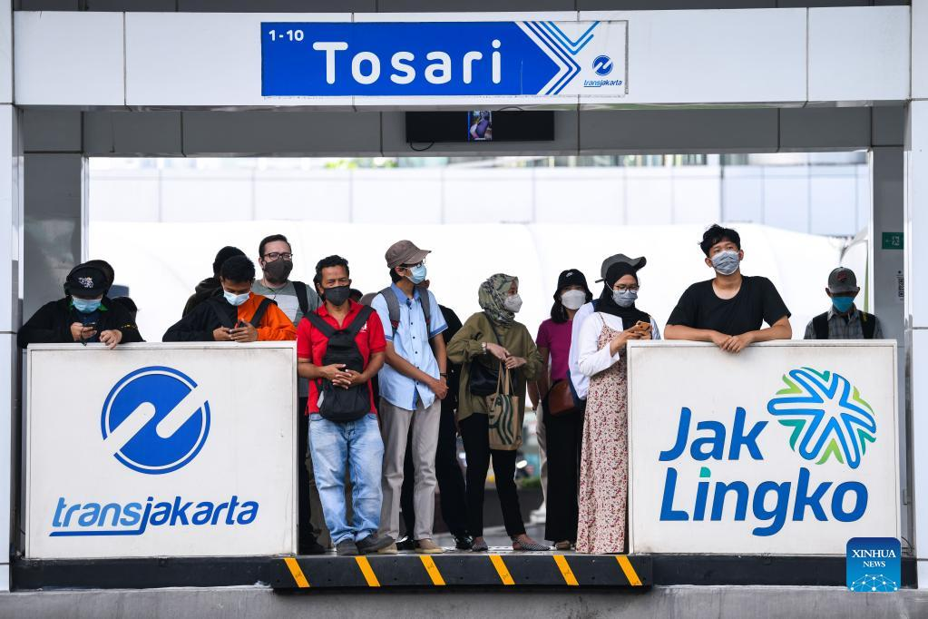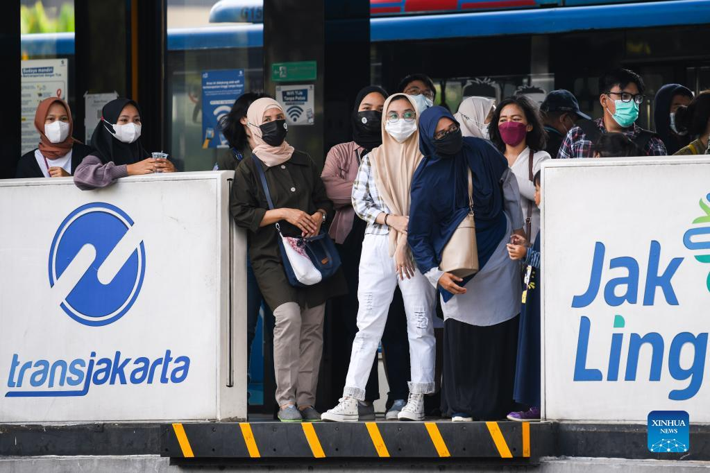 People wearing masks wait for buses at a bus stop in Jakarta, Indonesia, March 28, 2022. Indonesia has registered more than 6 million cases of COVID-19 since the first case was confirmed in the country in March 2020. On Monday, the Health Ministry reported that the coronavirus cases across the archipelago rose by 2,798 within the past 24 hours to 6,001,751 with the death toll adding by 104 to 154,774. (Xinhua/Xu Qin)