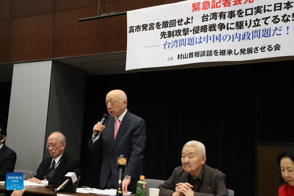 TOKYO, Dec. 9 (Xinhua) -- Over a dozen Japanese scholars, former government officials and media figures held a press conference in Tokyo on Monday, urging Prime Minister Sanae Takaichi to immediately retract her earlier erroneous remarks on Taiwan, warning the comments could further strain Japan-China relations.