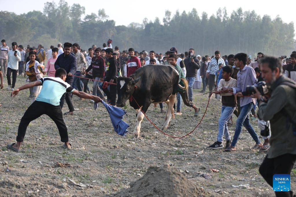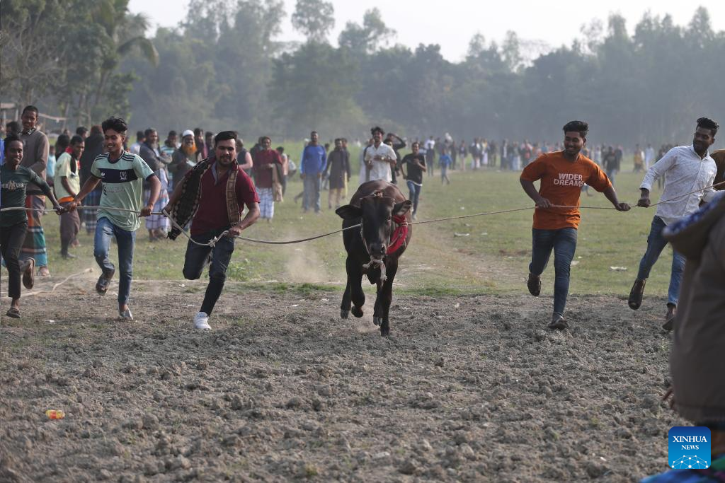 People and a cow participate in a traditional rural bull race in Dohar Upazila, on the outskirts of Dhaka, Bangladesh, Jan. 23, 2026. Traditional bull races are popular in the area and have generated great excitement among local audiences. (Photo by Habibur Rahman/Xinhua)