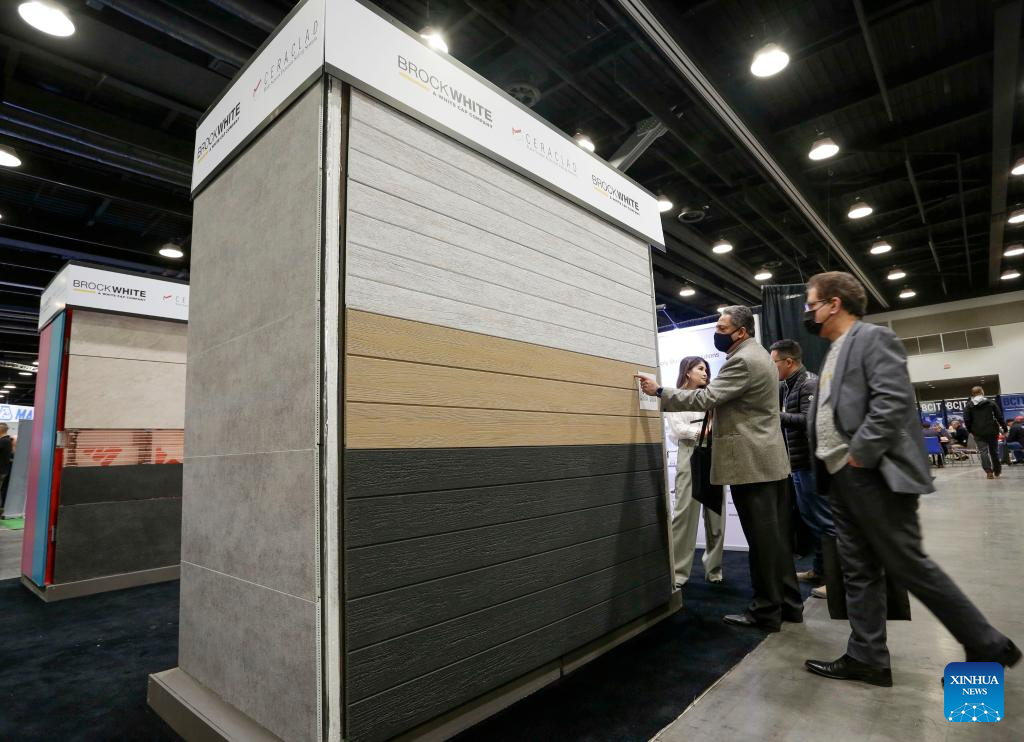 People look at wall construction materials during the 2022 BUILDEX show in Vancouver, British Columbia, Canada, on March 23, 2022. As one of Canada's largest conferences and trade shows for building industry, the 2022 BUILDEX Vancouver kicked off on Wednesday, showcasing the latest building materials, products and technologies. (Photo by Liang Sen/Xinhua)