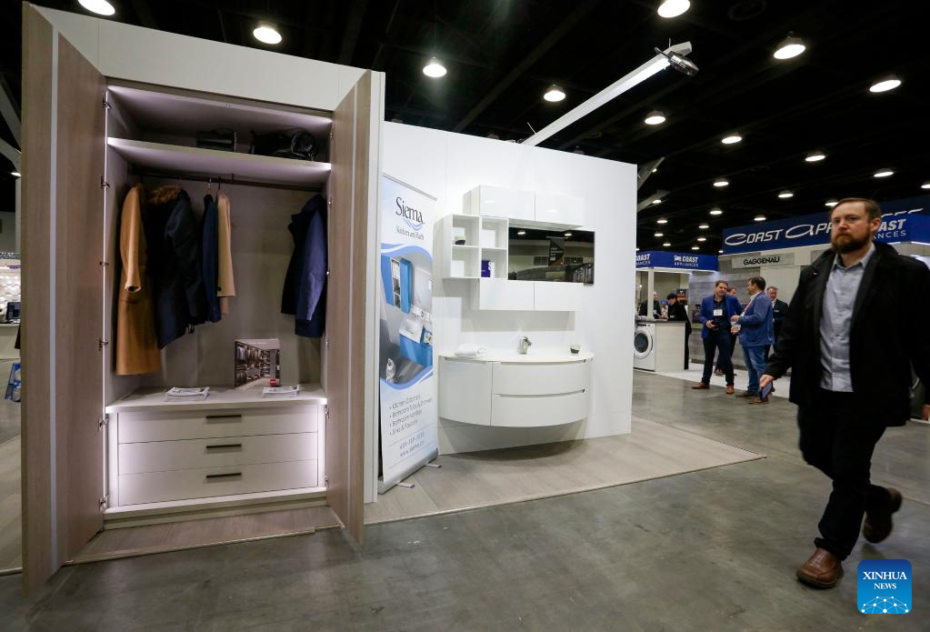 A man walks past kitchen and bath products during the 2022 BUILDEX show in Vancouver, British Columbia, Canada, on March 23, 2022. As one of Canada's largest conferences and trade shows for building industry, the 2022 BUILDEX Vancouver kicked off on Wednesday, showcasing the latest building materials, products and technologies. (Photo by Liang Sen/Xinhua)