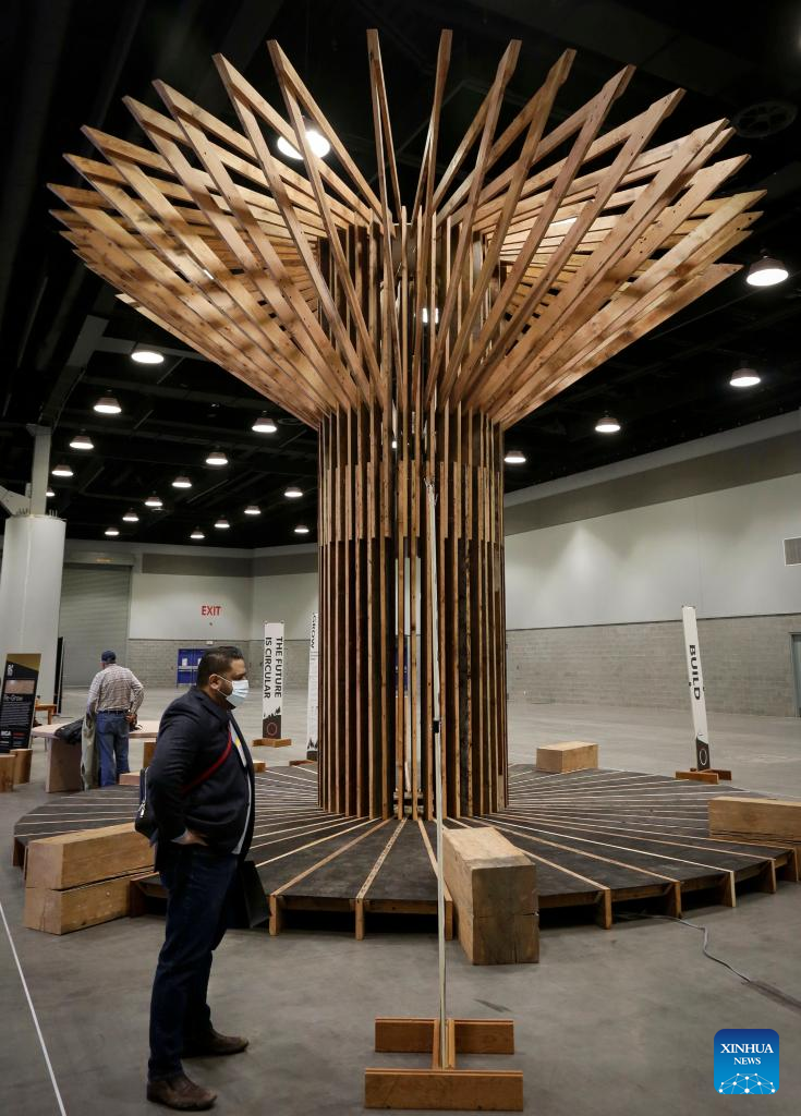 An architectural structure made from plywood panels is displayed during the 2022 BUILDEX show in Vancouver, British Columbia, Canada, on March 23, 2022. As one of Canada's largest conferences and trade shows for building industry, the 2022 BUILDEX Vancouver kicked off on Wednesday, showcasing the latest building materials, products and technologies. (Photo by Liang Sen/Xinhua)