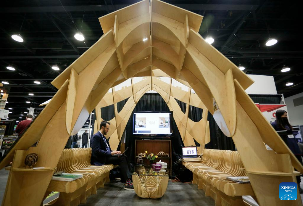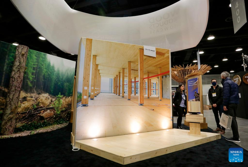 A visitor looks at a wooden construction design during the 2022 BUILDEX show in Vancouver, British Columbia, Canada, on March 23, 2022. As one of Canada's largest conferences and trade shows for building industry, the 2022 BUILDEX Vancouver kicked off on Wednesday, showcasing the latest building materials, products and technologies. (Photo by Liang Sen/Xinhua)