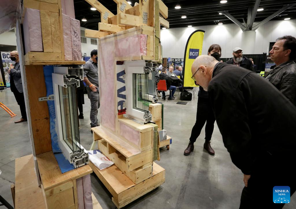 Visitors look at wall insulation designs during the 2022 BUILDEX show in Vancouver, British Columbia, Canada, on March 23, 2022. As one of Canada's largest conferences and trade shows for building industry, the 2022 BUILDEX Vancouver kicked off on Wednesday, showcasing the latest building materials, products and technologies. (Photo by Liang Sen/Xinhua)