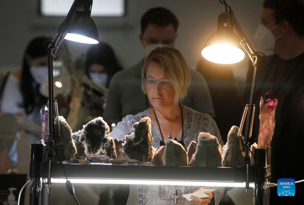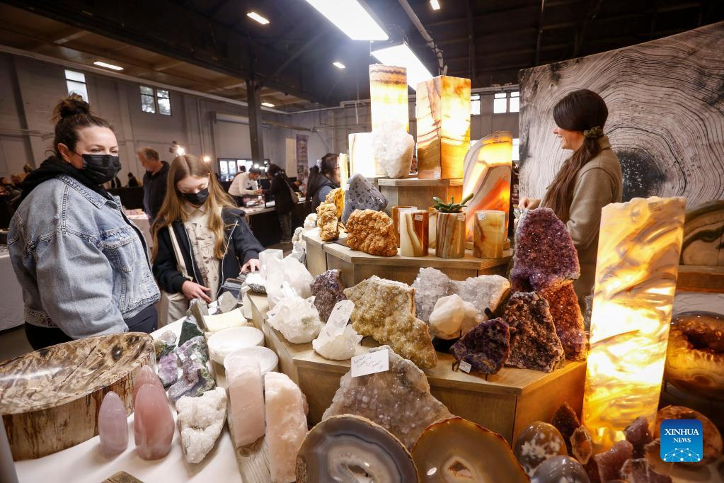 Visitors look at gemstones displayed during the Gem and Mineral Show in Vancouver, British Columbia, Canada, on March 25, 2022. The three-day show features about 100 vendors from across Canada with their gem, mineral and rare fossil collections. (Photo by Liang Sen/Xinhua)