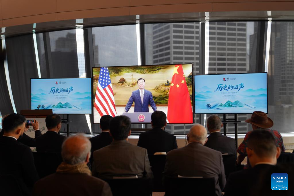 Chinese Ambassador to the United States Xie Feng delivers a video speech at the 2025 Kuliang Forum in New York, the United States, on Nov. 25, 2025. China and the United States can rise above differences and jointly write a new chapter in their friendly exchanges and cooperation, Xie said on Tuesday. (Xinhua/Zhang Fengguo)