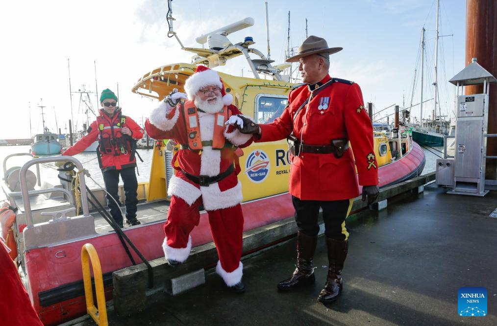 A member of the Royal Canadian Mounted Police assists a man dressed as Santa Claus as the latter disembarks from a boat at Fisherman's Wharf in Steveston Village, Richmond, British Columbia, Canada, Dec. 7, 2025.