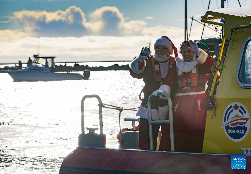 Two persons dressed as Santa Claus and Mrs. Claus wave to the crowd as they travel by boat to Fisherman's Wharf in Steveston Village, Richmond, British Columbia, Canada, Dec. 7, 2025.