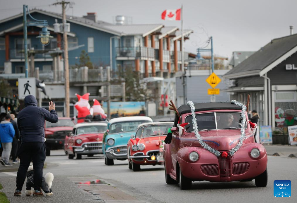 Classic cars cruise down the street during the annual Christmas Classic Car Cruise event in Richmond, British Columbia, Canada, Dec. 7, 2025.
