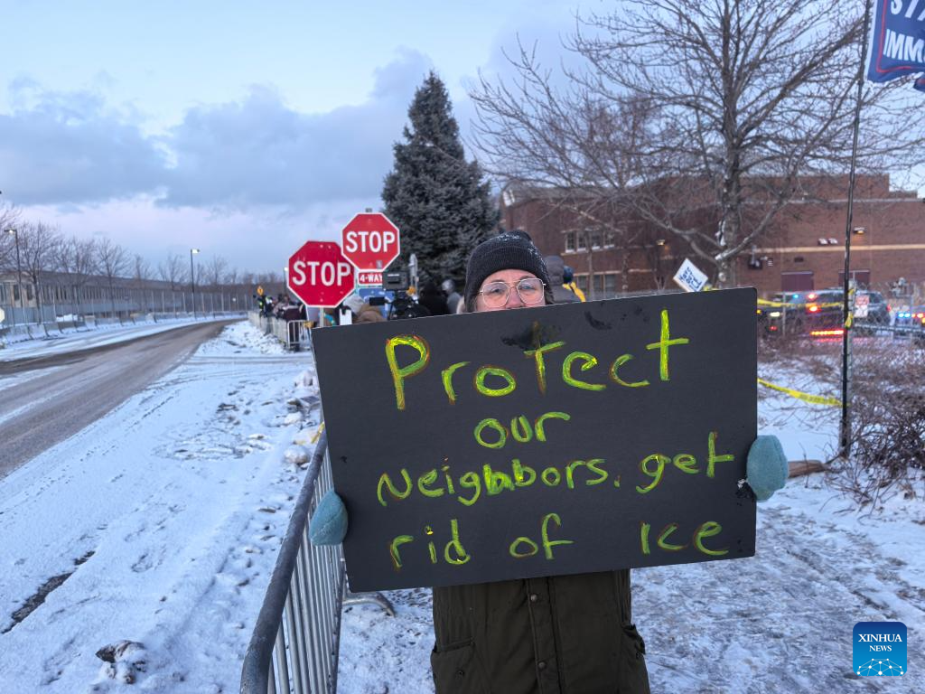 A demonstrator attends a protest outside the Bishop Henry Whipple Federal Building in Minneapolis, Minnesota, the United States, on Jan. 21, 2026. The fatal shooting of a U.S. woman by an Immigration and Customs Enforcement (ICE) agent in Minneapolis has continued to stoke tensions locally and nationwide, as state and federal officials sharply clash over how the incident unfolded and should be handled. (Xinhua)