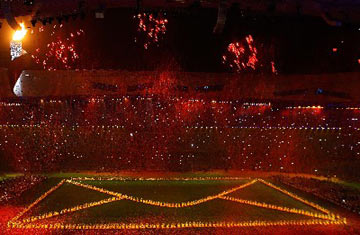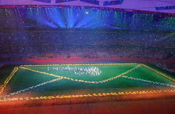 Performance: A Letter to the Future Red leaves of Fragrant Hill are shaked off at the center of the field during the art performance "A Letter to the Future" of the closing ceremony of Beijing Paralympic Games.