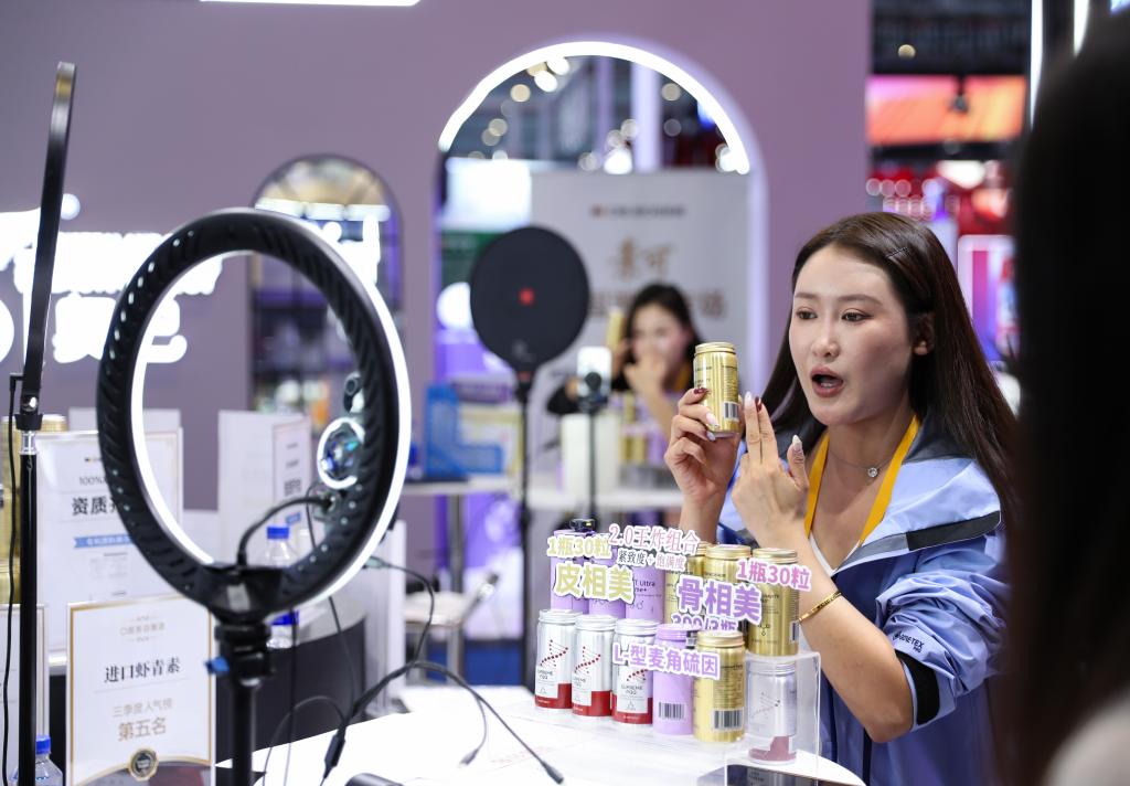 11月5日,主播在第八届进博会医疗器械及医药保健展区直播。