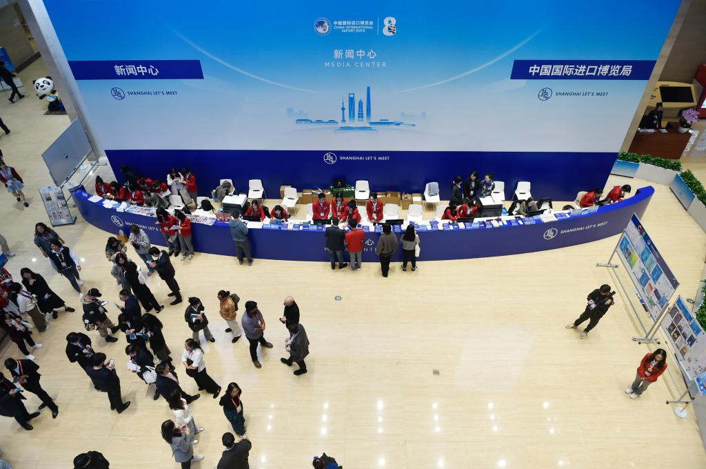 11月5日,媒体记者在第八届进博会新闻中心内工作。