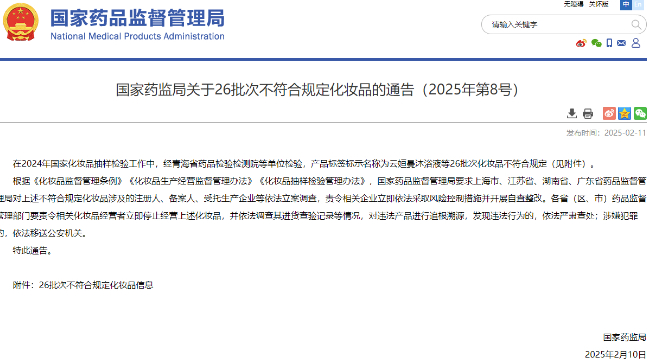 國(guó)家藥監(jiān)局關(guān)于26批次不符合規(guī)定化妝品的通告(2025年第8號(hào))