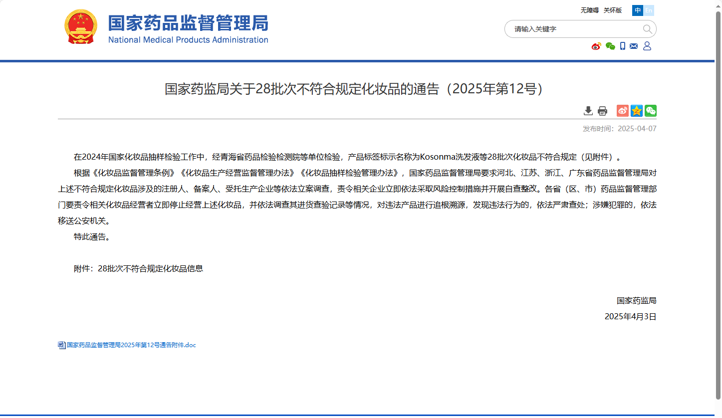 國(guó)家藥監(jiān)局關(guān)于37批次不符合規(guī)定化妝品的通告(2025年第45號(hào))
