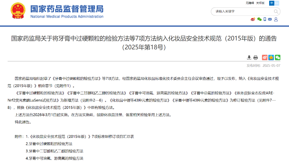 國(guó)家藥監(jiān)局關(guān)于將牙膏中過(guò)硬顆粒的檢驗(yàn)方法等7項(xiàng)方法納入化妝品安全技術(shù)規(guī)范(2015年版)的通告(2025年第18號(hào))