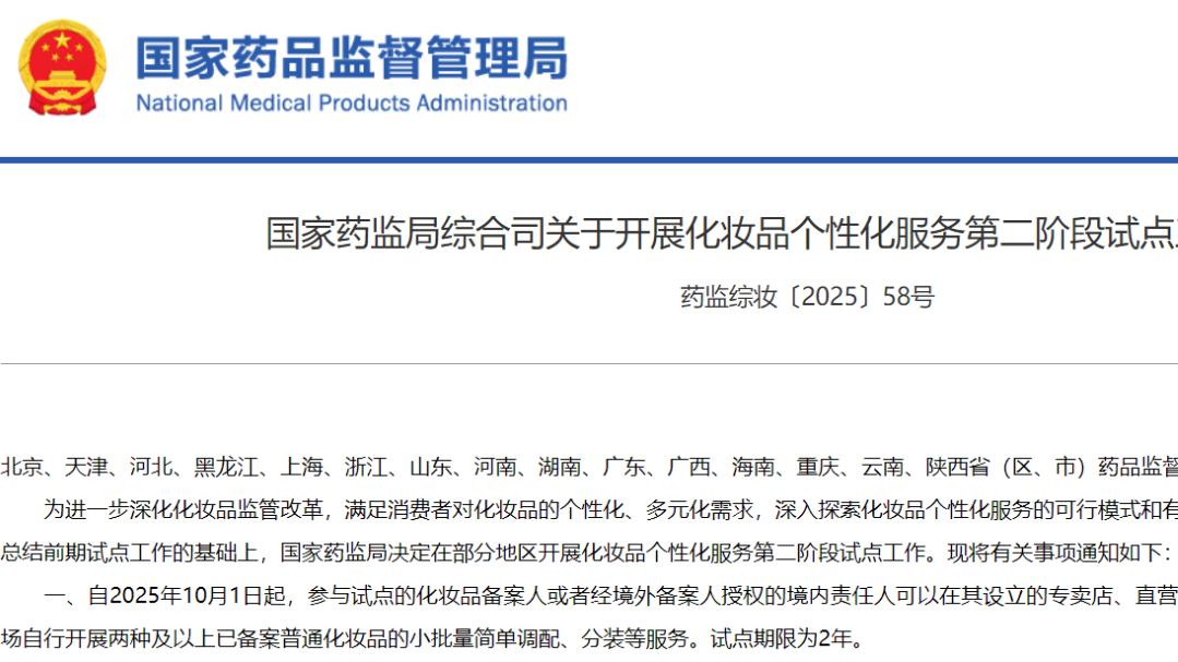 國(guó)家藥監(jiān)局綜合司關(guān)于開(kāi)展化妝品個(gè)性化服務(wù)第二階段試點(diǎn)工作的通知 藥監(jiān)綜妝〔2025〕58號(hào)