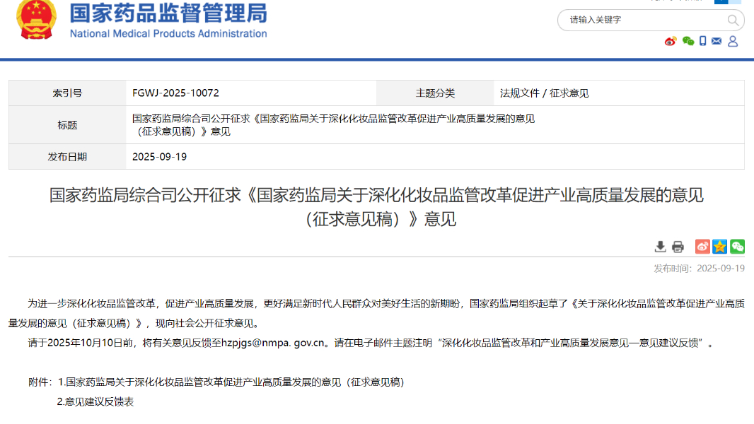 國(guó)家藥監(jiān)局綜合司公開(kāi)征求《國(guó)家藥監(jiān)局關(guān)于深化化妝品監(jiān)管改革促進(jìn)產(chǎn)業(yè)高質(zhì)量發(fā)展的意見(jiàn)(征求意見(jiàn)稿)》意見(jiàn)