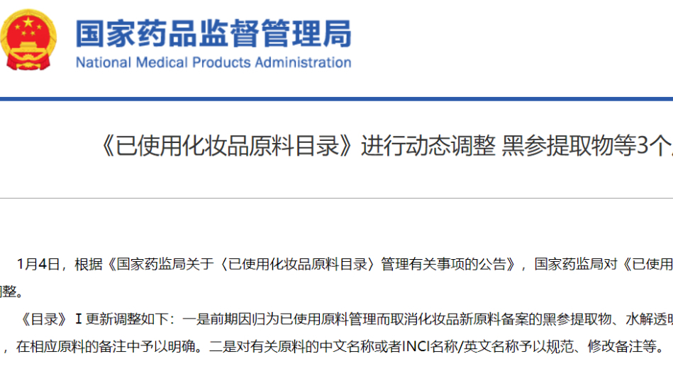 《已使用化妝品原料目錄》進行動態(tài)調(diào)整 黑參提取物等3個原料按照已使用原料管理
