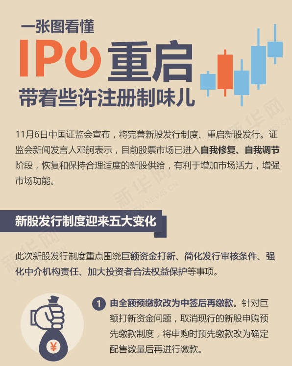 ????新華網(wǎng)北京11月6日電(記者 屈紹輝)6日中國證監(jiān)會(huì)宣布,將完善新股發(fā)行制度重啟新股發(fā)行。證監(jiān)會(huì)相關(guān)負(fù)責(zé)人表示,此次改革重點(diǎn)圍繞解決巨額資金打新、簡化發(fā)行審核條件、強(qiáng)化中介機(jī)構(gòu)責(zé)任、加大投資者合法權(quán)益保護(hù)等事項(xiàng),這是新股發(fā)行體制改革的進(jìn)一步深化,朝著股票注冊制改革的方向又邁出了堅(jiān)實(shí)的一步。