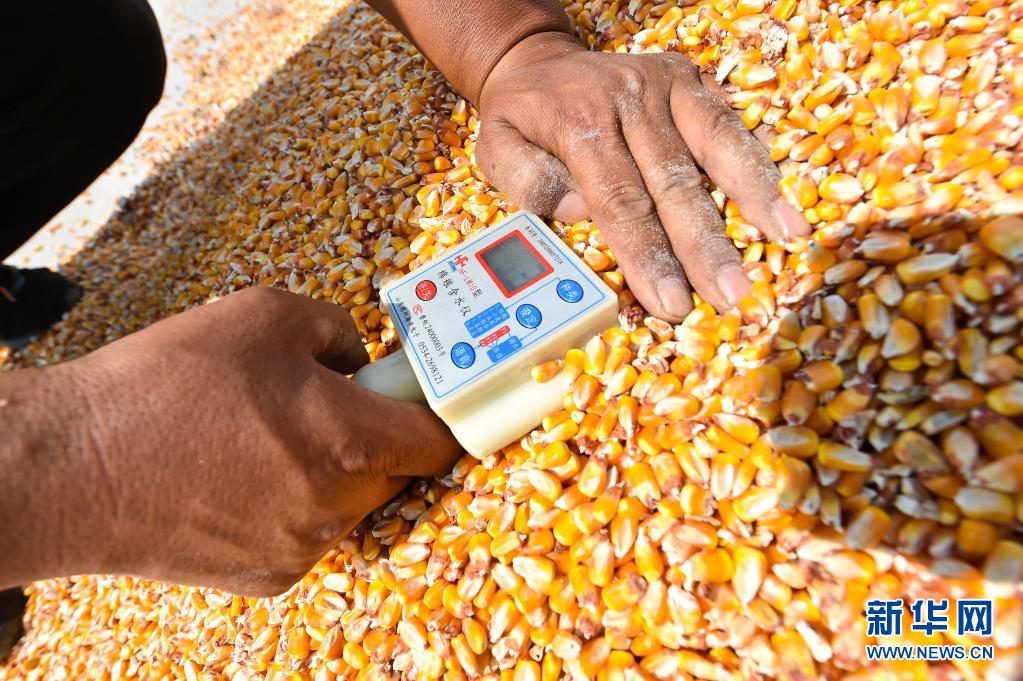 在山西省運城市萬榮縣南張鄉(xiāng)太趙村,種糧戶李挺用儀器測量玉米的含水量(2020年9月20日攝)。據李挺介紹,農機GPS定位、無人機噴灑農藥、機械化收割等已滲透到農業(yè)生產的各個環(huán)節(jié),臉朝黃土背朝天的農民變成了指揮機器高效種糧的“新農夫”。