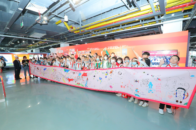 在現(xiàn)場,為了慶祝這場期待已久的航天科普展開幕,孩子們用一份“特別的禮物”——一幅繪滿了航天夢想與武漢名勝的5米長卷獻(xiàn)禮中國航天。在這幅長卷上,孩子們不僅生動地描繪出了武漢的眾多名勝特色,還用天馬行空的想象力展現(xiàn)了自己的航天夢。展區(qū)內(nèi),孩子們在講解員的帶領(lǐng)下參觀形形色色的“國之重器”,了解中國航天發(fā)展史,并且通過VR等設(shè)備親自體驗了一把“太空旅行”。在航天夢想體驗營中,孩子們一起回顧了空間站發(fā)射的精彩瞬間,當(dāng)看到“長五B”成功升空時,現(xiàn)場爆發(fā)出熱烈的歡呼和掌聲,加油聲此起彼伏,許多孩子還合唱《明天會更好》對中國航天獻(xiàn)上祝福。