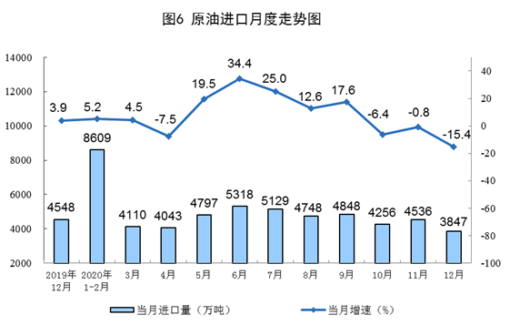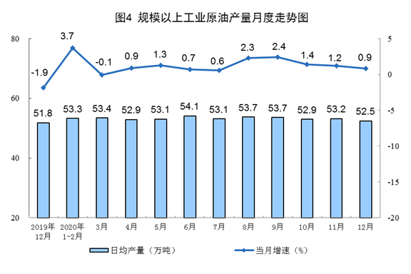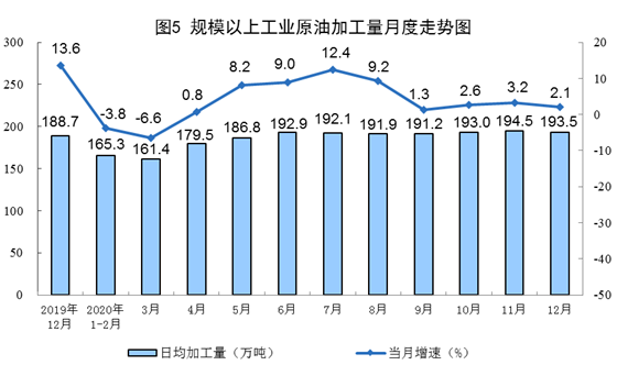 原油生產(chǎn)增速略有放緩。12月份,生產(chǎn)原油1627萬噸,同比增長0.9%,增速比上月回落0.3個百分點(diǎn);日產(chǎn)52.5萬噸,環(huán)比減少0.7萬噸。加工原油6000萬噸,同比增長2.1%,比上月回落1.1個百分點(diǎn)。2020年,生產(chǎn)原油1.95億噸,比上年增長1.6%;加工原油6.7億噸,增長3.0%。