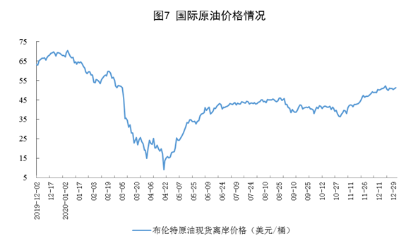 原油進(jìn)口降幅擴(kuò)大,國際原油價格繼續(xù)上漲。進(jìn)口原油3847萬噸,環(huán)比減少689萬噸,同比下降15.4%,降幅比上月擴(kuò)大14.6個百分點(diǎn);2020年,進(jìn)口原油5.4億噸,比上年增長7.3%。12月31日,布倫特原油現(xiàn)貨離岸價格為51.22美元/桶,比11月30日的46.84美元/桶上漲9.4%。
